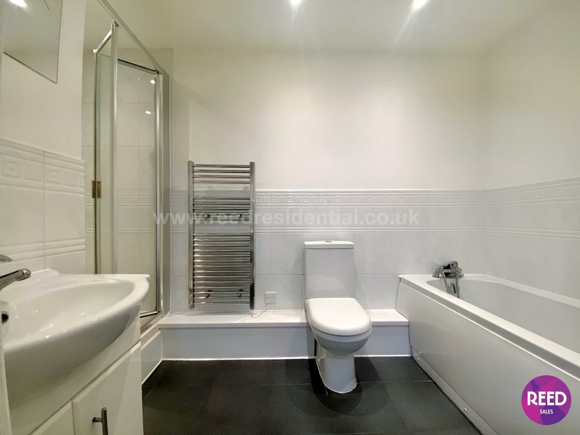 A modern bathroom completes the accommodation, featuring high-quality fixtures and fittings, including a bath with an overhead shower, a wash basin, and a WC. The neutral décor and clean lines create a fresh and inviting space.